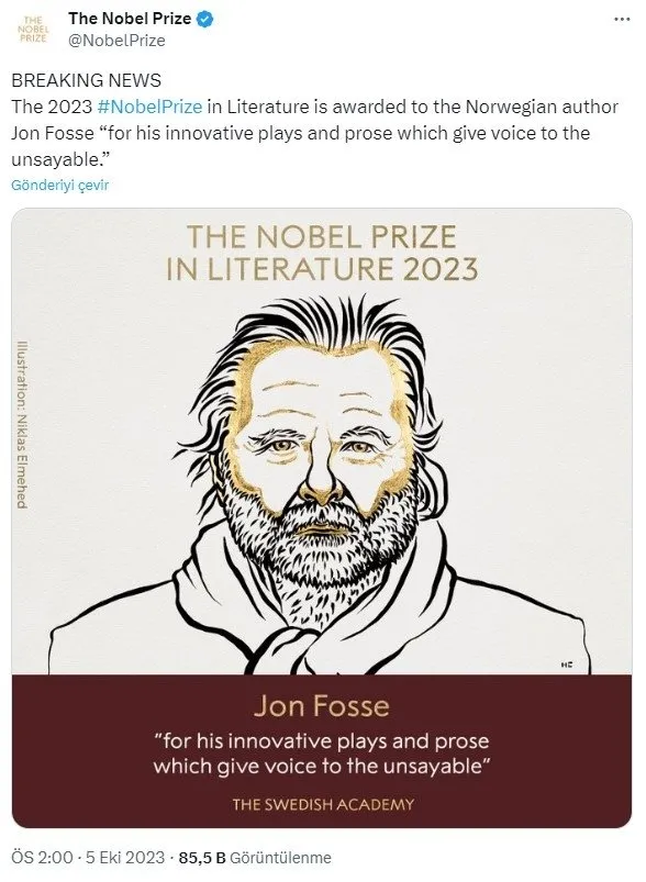 ALINTI KAYNAK: https://www.ahaber.com.tr/dunya/2023/10/05/son-dakika-2023-nobel-edebiyat-odulunun-sahibi-norvecli-yazar-jon-fosse-oldu